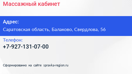 Массажный кабинет по адресу Саратовская область, Балаково, Свердлова, 56 в дальнейшем Организация, размещена в следующих категориях: