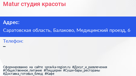 Matur, студия красоты по адресу Саратовская область, Балаково, Медицинский проезд, 6 в дальнейшем Организация, размещена в следующих категориях: