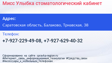 Мисс Улыбка, стоматологический кабинет по адресу Саратовская область, Балаково, Трнавская, 38 в дальнейшем Организация, размещена в следующих категориях: