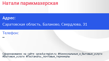 Натали, парикмахерская по адресу Саратовская область, Балаково, Свердлова, 31 в дальнейшем Организация, размещена в следующих категориях: