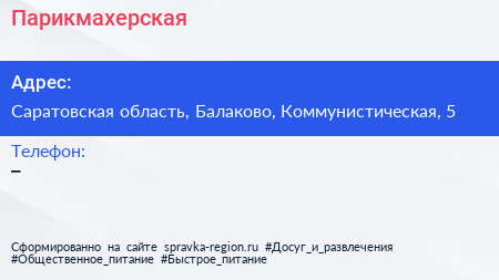 Парикмахерская по адресу Саратовская область, Балаково, Коммунистическая, 5 в дальнейшем Организация, размещена в следующих категориях: