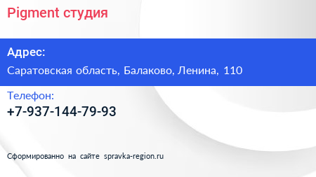 Pigment, студия по адресу Саратовская область, Балаково, Ленина, 110 в дальнейшем Организация, размещена в следующих категориях: