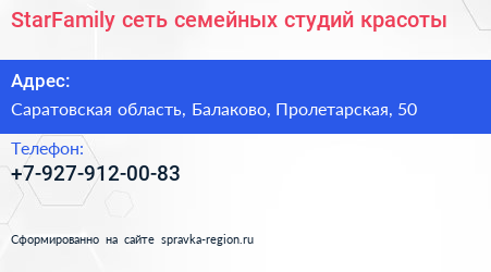 StarFamily, сеть семейных студий красоты по адресу Саратовская область, Балаково, Пролетарская, 50 в дальнейшем Организация, размещена в следующих категориях: