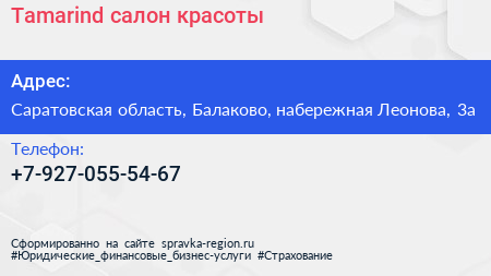 Tamarind, салон красоты по адресу Саратовская область, Балаково, набережная Леонова, 3а в дальнейшем Организация, размещена в следующих категориях:
