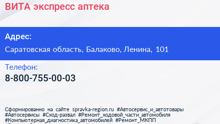 ВИТА экспресс, аптека по адресу Саратовская область, Балаково, Ленина, 101 в дальнейшем Организация, размещена в следующих категориях: