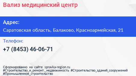 Вализ, медицинский центр по адресу Саратовская область, Балаково, Красноармейская, 21 в дальнейшем Организация, размещена в следующих категориях: