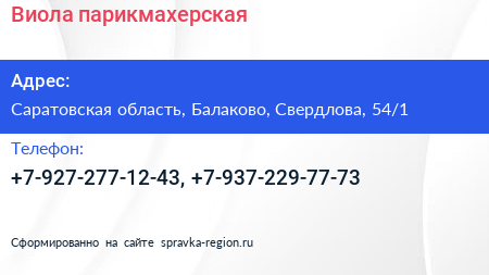 Виола, парикмахерская по адресу Саратовская область, Балаково, Свердлова, 54/1 в дальнейшем Организация, размещена в следующих категориях: