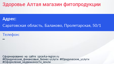 Здоровье Алтая, магазин фитопродукции по адресу Саратовская область, Балаково, Пролетарская, 50/1 в дальнейшем Организация, размещена в следующих категориях: