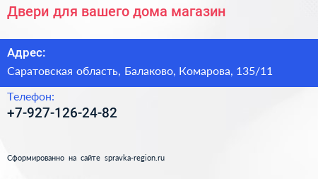 Двери для вашего дома, магазин по адресу Саратовская область, Балаково, Комарова, 135/11 в дальнейшем Организация, размещена в следующих категориях:
