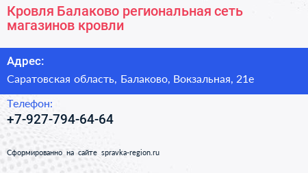 Кровля-Балаково, региональная сеть магазинов кровли по адресу Саратовская область, Балаково, Вокзальная, 21е в дальнейшем Организация, размещена в следующих категориях: