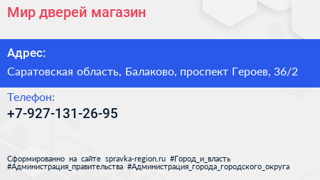 Мир дверей, магазин по адресу Саратовская область, Балаково, проспект Героев, 36/2 в дальнейшем Организация, размещена в следующих категориях: