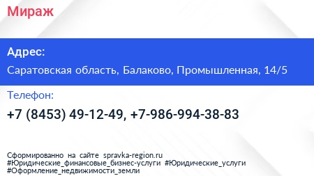 Мираж по адресу Саратовская область, Балаково, Промышленная, 14/5 в дальнейшем Организация, размещена в следующих категориях: