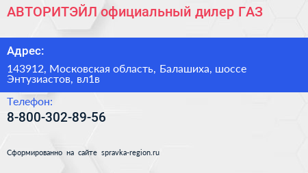 АВТОРИТЭЙЛ, официальный дилер ГАЗ по адресу 143912, Московская область, Балашиха, шоссе Энтузиастов, вл1в в дальнейшем Организация, размещена в следующих категориях: