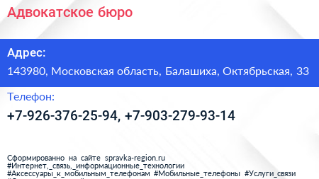 Адвокатское бюро по адресу 143980, Московская область, Балашиха, Октябрьская, 33 в дальнейшем Организация, размещена в следующих категориях: