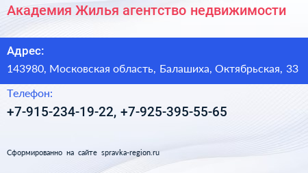 Академия Жилья, агентство недвижимости по адресу 143980, Московская область, Балашиха, Октябрьская, 33 в дальнейшем Организация, размещена в следующих категориях: