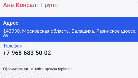 Анв Консалт Групп по адресу 143930, Московская область, Балашиха, Разинское шоссе, 69 в дальнейшем Организация, размещена в следующих категориях:
