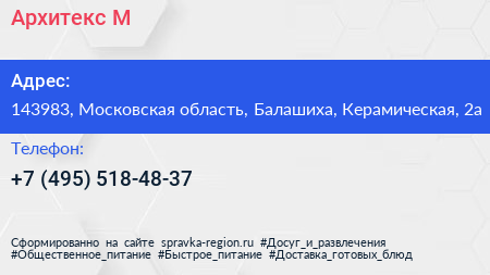 Архитекс М по адресу 143983, Московская область, Балашиха, Керамическая, 2а в дальнейшем Организация, размещена в следующих категориях: