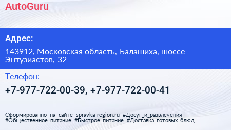 AutoGuru по адресу 143912, Московская область, Балашиха, шоссе Энтузиастов, 32 в дальнейшем Организация, размещена в следующих категориях: