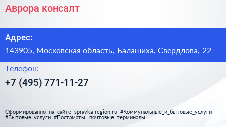 Аврора консалт по адресу 143905, Московская область, Балашиха, Свердлова, 22 в дальнейшем Организация, размещена в следующих категориях: