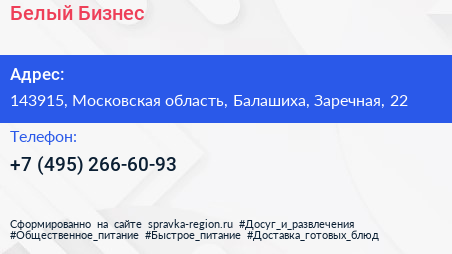 Белый Бизнес по адресу 143915, Московская область, Балашиха, Заречная, 22 в дальнейшем Организация, размещена в следующих категориях: