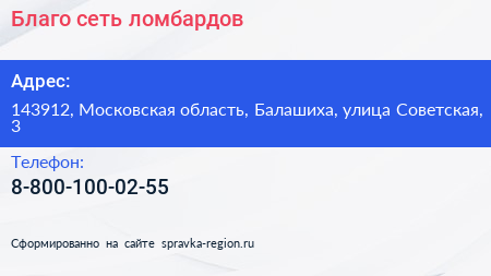 Благо, сеть ломбардов по адресу 143912, Московская область, Балашиха, улица Советская, 3 в дальнейшем Организация, размещена в следующих категориях: