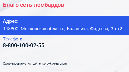 Благо, сеть ломбардов по адресу 143900, Московская область, Балашиха, Фадеева, 3 ст2 в дальнейшем Организация, размещена в следующих категориях: