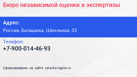 Бюро независимой оценки и экспертизы по адресу 33, Школьная улица, микрорайон Вишняковские Дачи, Электроугли, Богородский городской округ, Московская область, Центральный федеральный округ, 142455, Россия в дальнейшем Организация, размещена в следующих категориях:
