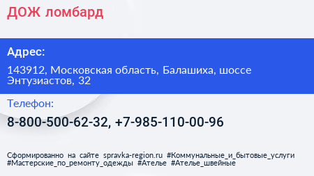 ДОЖ, ломбард по адресу 143912, Московская область, Балашиха, шоссе Энтузиастов, 32 в дальнейшем Организация, размещена в следующих категориях: