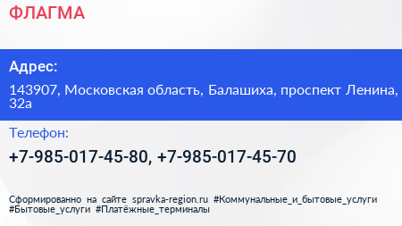 ФЛАГМА по адресу 143907, Московская область, Балашиха, проспект Ленина, 32а в дальнейшем Организация, размещена в следующих категориях: