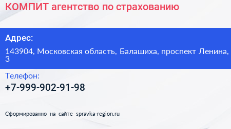 КОМПИТ, агентство по страхованию по адресу 143904, Московская область, Балашиха, проспект Ленина, 3 в дальнейшем Организация, размещена в следующих категориях: