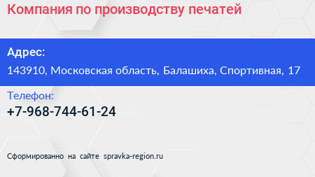 Компания по производству печатей по адресу 143910, Московская область, Балашиха, Спортивная, 17 в дальнейшем Организация, размещена в следующих категориях: