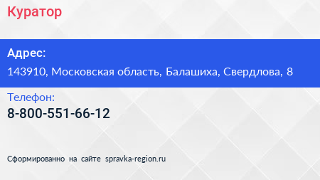 Куратор по адресу 143910, Московская область, Балашиха, Свердлова, 8 в дальнейшем Организация, размещена в следующих категориях: