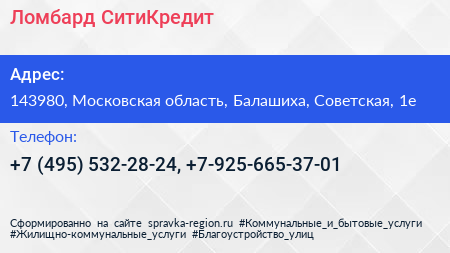 Ломбард СитиКредит по адресу 143980, Московская область, Балашиха, Советская, 1е в дальнейшем Организация, размещена в следующих категориях:
