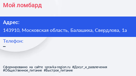 Мой ломбард по адресу 143910, Московская область, Балашиха, Свердлова, 1а в дальнейшем Организация, размещена в следующих категориях: