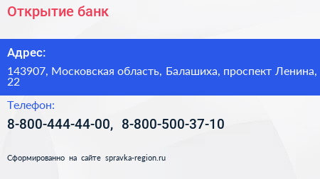 Открытие, банк по адресу 143907, Московская область, Балашиха, проспект Ленина, 22 в дальнейшем Организация, размещена в следующих категориях: