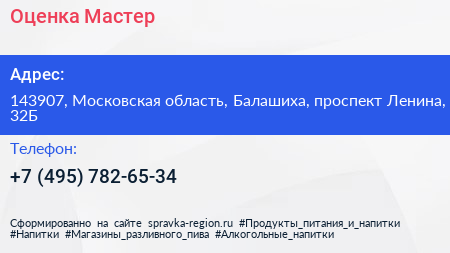 Оценка Мастер по адресу 143907, Московская область, Балашиха, проспект Ленина, 32Б в дальнейшем Организация, размещена в следующих категориях: