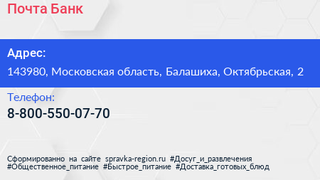 Почта Банк по адресу 143980, Московская область, Балашиха, Октябрьская, 2 в дальнейшем Организация, размещена в следующих категориях: