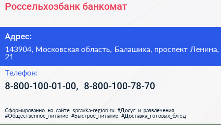 Россельхозбанк, банкомат по адресу 143904, Московская область, Балашиха, проспект Ленина, 21 в дальнейшем Организация, размещена в следующих категориях: