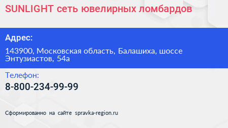 SUNLIGHT, сеть ювелирных ломбардов по адресу 143900, Московская область, Балашиха, шоссе Энтузиастов, 54а в дальнейшем Организация, размещена в следующих категориях:
