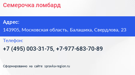 Семерочка, ломбард по адресу 143905, Московская область, Балашиха, Свердлова, 23 в дальнейшем Организация, размещена в следующих категориях: