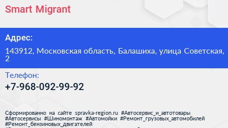 Smart Migrant по адресу 143912, Московская область, Балашиха, улица Советская, 2 в дальнейшем Организация, размещена в следующих категориях: