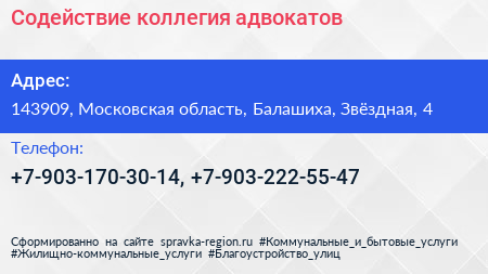 Содействие, коллегия адвокатов по адресу 143909, Московская область, Балашиха, Звёздная, 4 в дальнейшем Организация, размещена в следующих категориях: