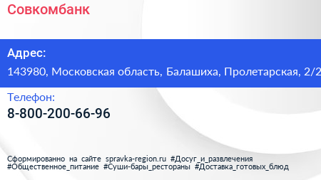 Совкомбанк по адресу 143980, Московская область, Балашиха, Пролетарская, 2/2 в дальнейшем Организация, размещена в следующих категориях: