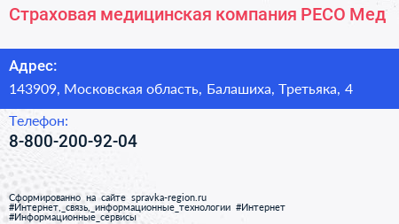 Страховая медицинская компания РЕСО-Мед по адресу 143909, Московская область, Балашиха, Третьяка, 4 в дальнейшем Организация, размещена в следующих категориях: