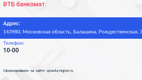ВТБ, банкомат по адресу 143980, Московская область, Балашиха, Рождественская, 3 в дальнейшем Организация, размещена в следующих категориях: