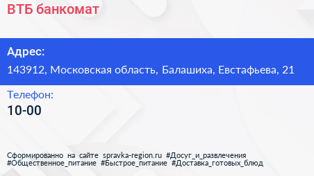 ВТБ, банкомат по адресу 143912, Московская область, Балашиха, Евстафьева, 21 в дальнейшем Организация, размещена в следующих категориях: