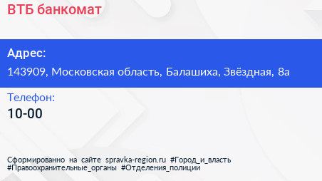 ВТБ, банкомат по адресу 143909, Московская область, Балашиха, Звёздная, 8а в дальнейшем Организация, размещена в следующих категориях:
