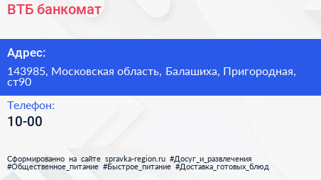 ВТБ, банкомат по адресу 143985, Московская область, Балашиха, Пригородная, ст90 в дальнейшем Организация, размещена в следующих категориях: