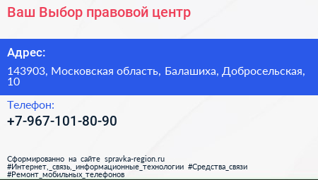 Ваш Выбор, правовой центр по адресу 143903, Московская область, Балашиха, Добросельская, 10 в дальнейшем Организация, размещена в следующих категориях: