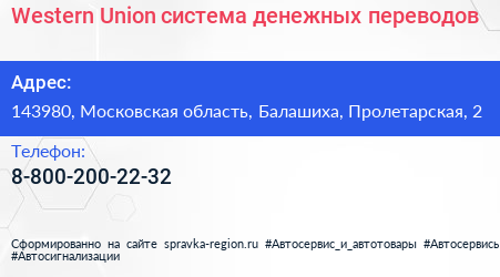 Western Union, система денежных переводов по адресу 143980, Московская область, Балашиха, Пролетарская, 2 в дальнейшем Организация, размещена в следующих категориях: